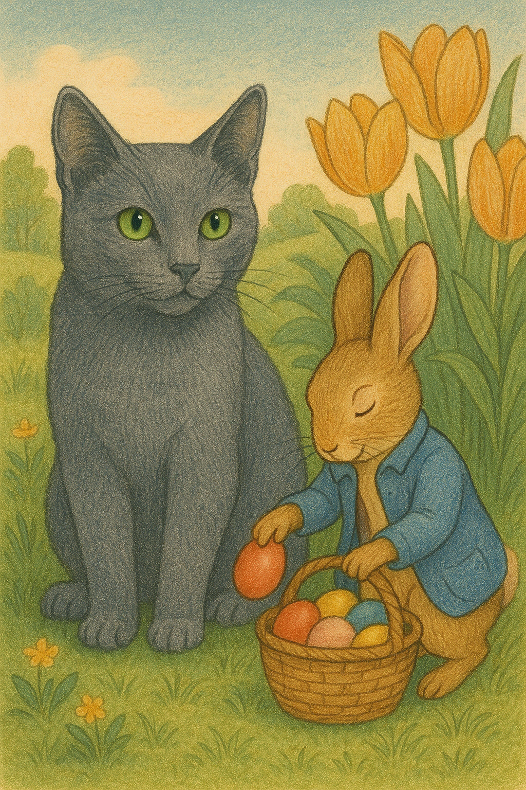 One bright, sunny morning, as the pastel-colored flowers bloomed and the air buzzed with anticipation of Easter Sunday, Tree stretched leisurely, soaking in the warmth of the sun. Suddenly, a flurry of rustling leaves drew his attention. Out from the thicket hopped Peter Rabbit, a well-known figure in the village, with his fluffy tail bouncing eagerly behind him.