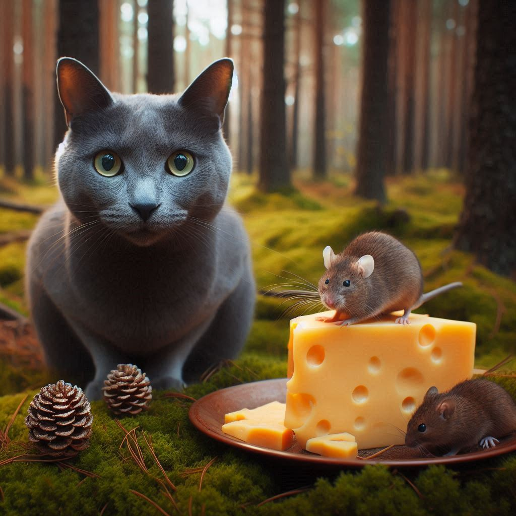 Once upon a time in a cozy little cottage nestled deep in the woods, lived Tree the Russian Blue cat and his unlikely best friend, a tiny mouse named Whiskers. Tree was known throughout the forest for his sleek silver fur and piercing green eyes, while Whiskers was famous for his speedy scurrying skills and his love for cheese.