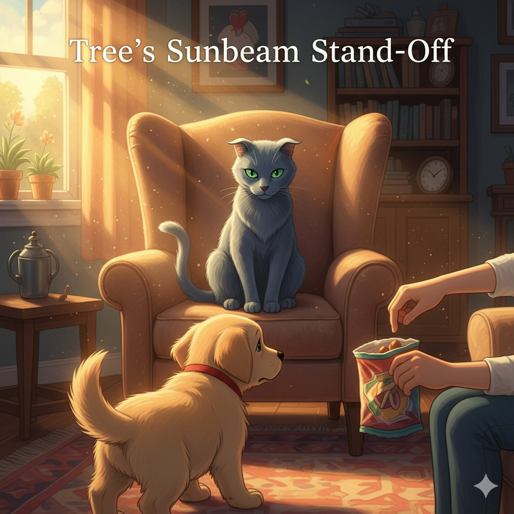As the afternoon waned, the perfect sunbeam began its inevitable retreat. It dwindled, then fractured, then faded entirely from the armchair. Tree was left on the now ordinary, slightly cool fabric, feeling… strangely empty. His perfect spot was gone, and he hadn’t moved from it all day. He looked around. The puppy was happily gnawing on his toy. His human was still on the sofa, now absent-mindedly stroking a throw pillow. The treat bag was long gone.
